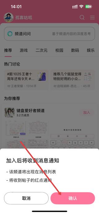 2、點(diǎn)擊加入后,彈出加入后將收到消息通知的提示框,點(diǎn)擊確認(rèn),成功加入鍵盤愛好者頻道。
