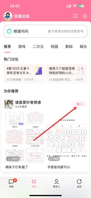 1、打開QQ,進(jìn)入頻道頁面,能看到推薦、游戲等分類,還有熱門討論和為你推薦的頻道,找到鍵盤愛好者頻道,點(diǎn)擊加入。