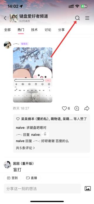 3、進(jìn)入鍵盤愛好者頻道后,能看到頻道內(nèi)的各類帖子,點(diǎn)擊右上角搜索圖標(biāo),進(jìn)入搜索頁面。