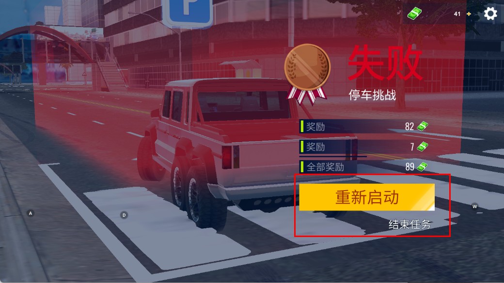 4、若停車挑戰(zhàn)失敗,可點(diǎn)擊重新啟動(dòng)按鈕,再次嘗試完成停車任務(wù),也可選擇結(jié)束任務(wù),退出當(dāng)前挑戰(zhàn)。