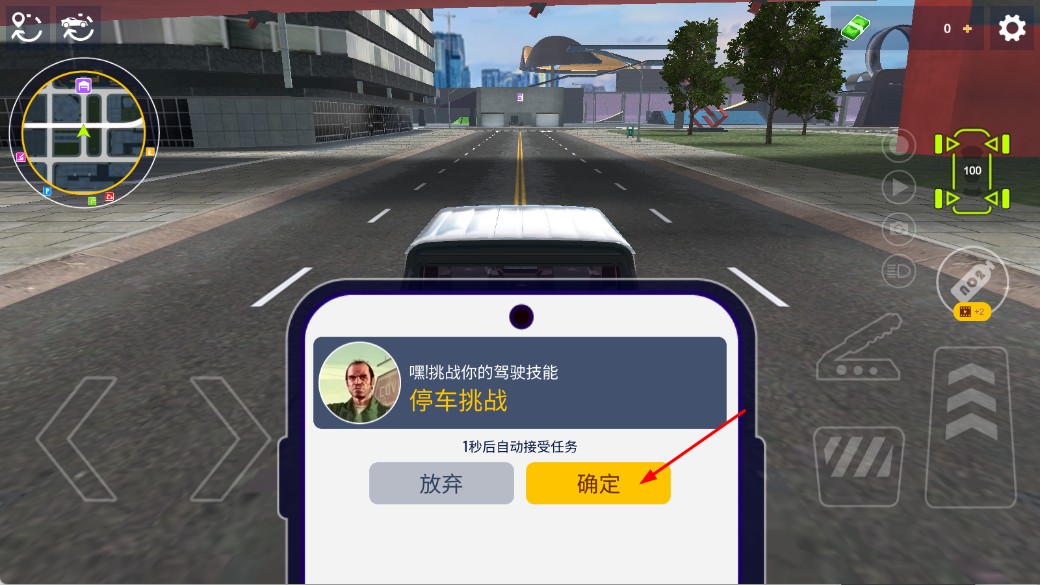 2、當(dāng)出現(xiàn)停車挑戰(zhàn)任務(wù)提示時(shí),點(diǎn)擊確定按鈕,即可接受任務(wù),開啟停車挑戰(zhàn)環(huán)節(jié),考驗(yàn)駕駛技能。
