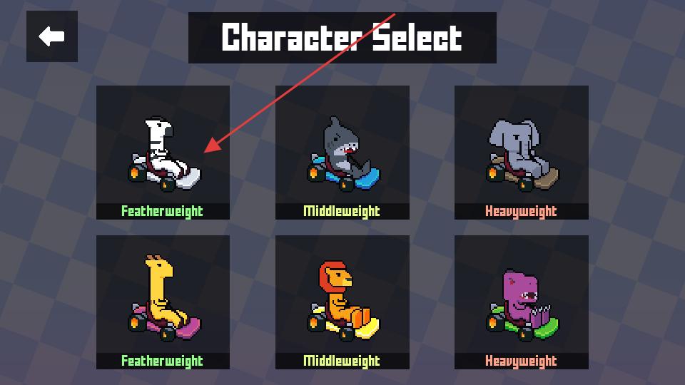 1、在游戲主界面點(diǎn)擊Race選項(xiàng),進(jìn)入角色選擇界面,能看到多個(gè)不同類型的卡通角色,每個(gè)角色對(duì)應(yīng)不同重量類別,準(zhǔn)備挑選合適角色。