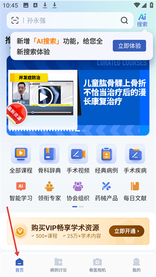 2、首頁(yè)有搜索欄,新增AI搜索功能,展示骨科課程,如兒童肱骨髁上骨折康復(fù)課,還有全課程、骨科辭典等入口,可購(gòu)VIP享學(xué)術(shù)資源。