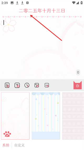 1、日記編輯頁,日期為二零二五年十月十三日,有櫻花等裝飾元素,可選擇系統(tǒng)或自定義日記樣式,方便記錄當日生活與心情。