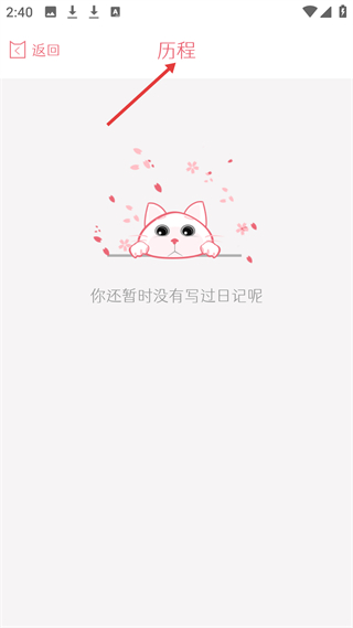 2、歷程頁面顯示暫未寫過日記,有可愛貓咪和櫻花元素,簡潔清新,可查看過往日記記錄情況。