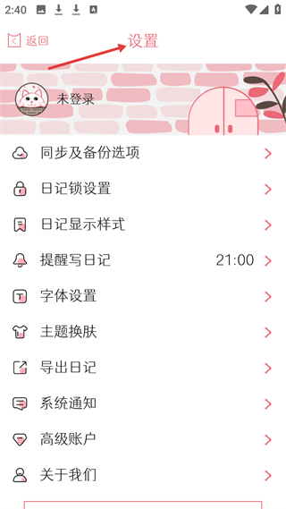 3、設置頁面有同步備份、日記鎖、顯示樣式等多項設置,還能設置寫日記提醒時間,滿足個性化需求。