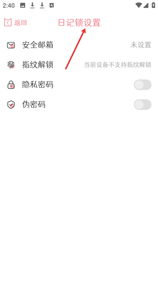 4、日記鎖設置頁面,可設置安全郵箱、隱私密碼等,當前設備不支持指紋解鎖,能有效保護日記隱私。