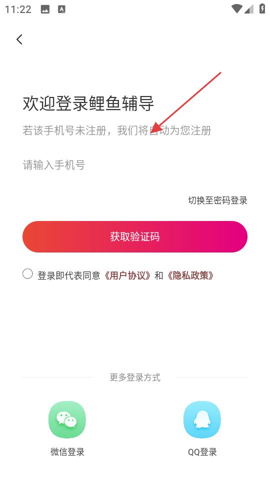 2、登錄界面,用戶輸入手機(jī)號(hào)獲取驗(yàn)證碼后可登錄,若手機(jī)號(hào)未注冊(cè)會(huì)自動(dòng)注冊(cè),也可選擇微信或QQ登錄。