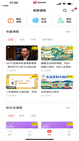 3、課程界面分精品課、知識(shí)點(diǎn)課等,專題課含古詩(shī)詞等VIP課,如李清泉老師講小學(xué)必背古詩(shī),助力拓展。