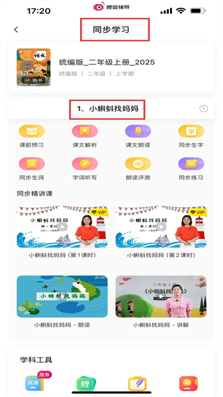 4、同步學(xué)習(xí)小蝌蚪找媽媽學(xué)習(xí)界面,有課前預(yù)習(xí)、課文解析,配多課時(shí)精講課與朗讀視頻,附學(xué)科工具。