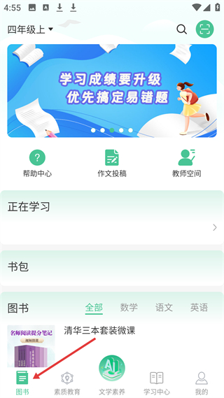 1、圖書頁面適配四年級上冊,有搞定易錯題活動,設(shè)幫助中心等功能,展示清華三本套裝微課等圖書。