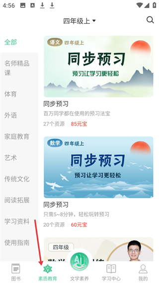 2、素質(zhì)教育頁面,針對四年級上冊,有語文、數(shù)學同步預習資源,分名師精品課、體育等類別,助力預習學習。