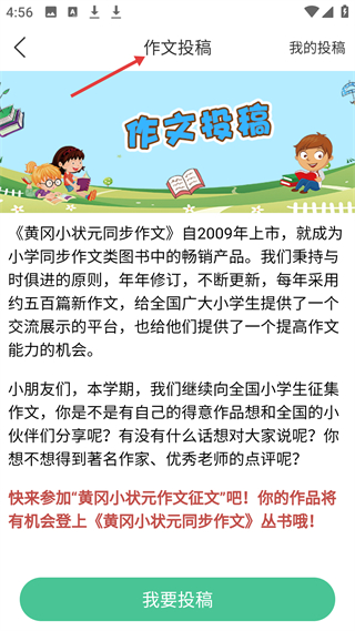 3、作文投稿頁面介紹黃岡小狀元同步作文,征集小學生作文,優(yōu)秀作品有機會登叢書,提供我要投稿入口。
