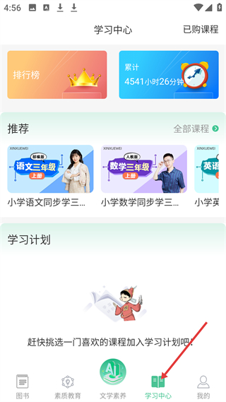 4、學習中心頁面,可看排行榜、學習時長,推薦語文、數(shù)學等同步課程,能挑選課程加入學習計劃管理已購課程。
