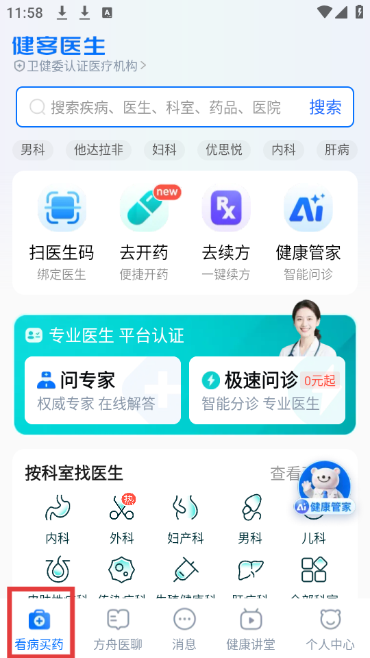 1、健客醫(yī)生看病買(mǎi)藥頁(yè),含搜索欄與多科室標(biāo)簽,有掃醫(yī)生碼、開(kāi)藥等功能,還能問(wèn)專家提供便捷醫(yī)療服務(wù)入口。