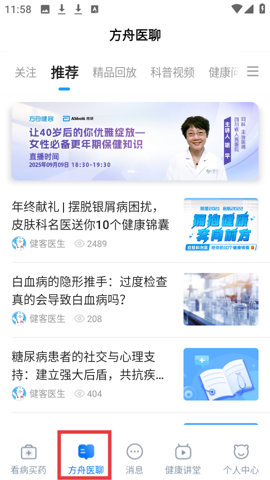 2、方舟醫(yī)聊頁(yè)分關(guān)注推薦等板塊,展示健康科普視頻和直播預(yù)告,像女性更年期保健內(nèi)容助力用戶學(xué)習(xí)健康知識(shí)。