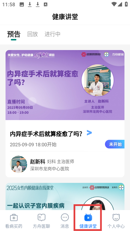 3、健康講堂頁(yè)以預(yù)告、回放等分類,展示內(nèi)異癥手術(shù)等健康直播信息,標(biāo)注時(shí)間與主講人方便用戶安排觀看。