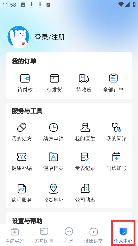 4、個(gè)人中心頁(yè)有登錄注冊(cè)入口,集成我的訂單、服務(wù)工具我的處方等和設(shè)置幫助功能,便于管理個(gè)人醫(yī)療相關(guān)事務(wù)。