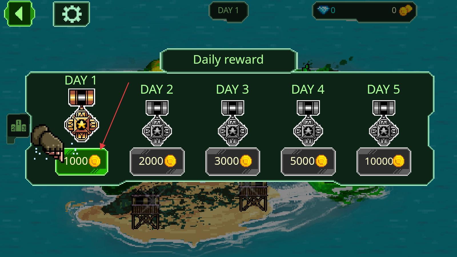 2、進(jìn)入日常獎(jiǎng)勵(lì)界面,顯示五天獎(jiǎng)勵(lì)內(nèi)容,點(diǎn)擊第一天綠色1000金幣按鈕,領(lǐng)取當(dāng)日獎(jiǎng)勵(lì),積累游戲資源。