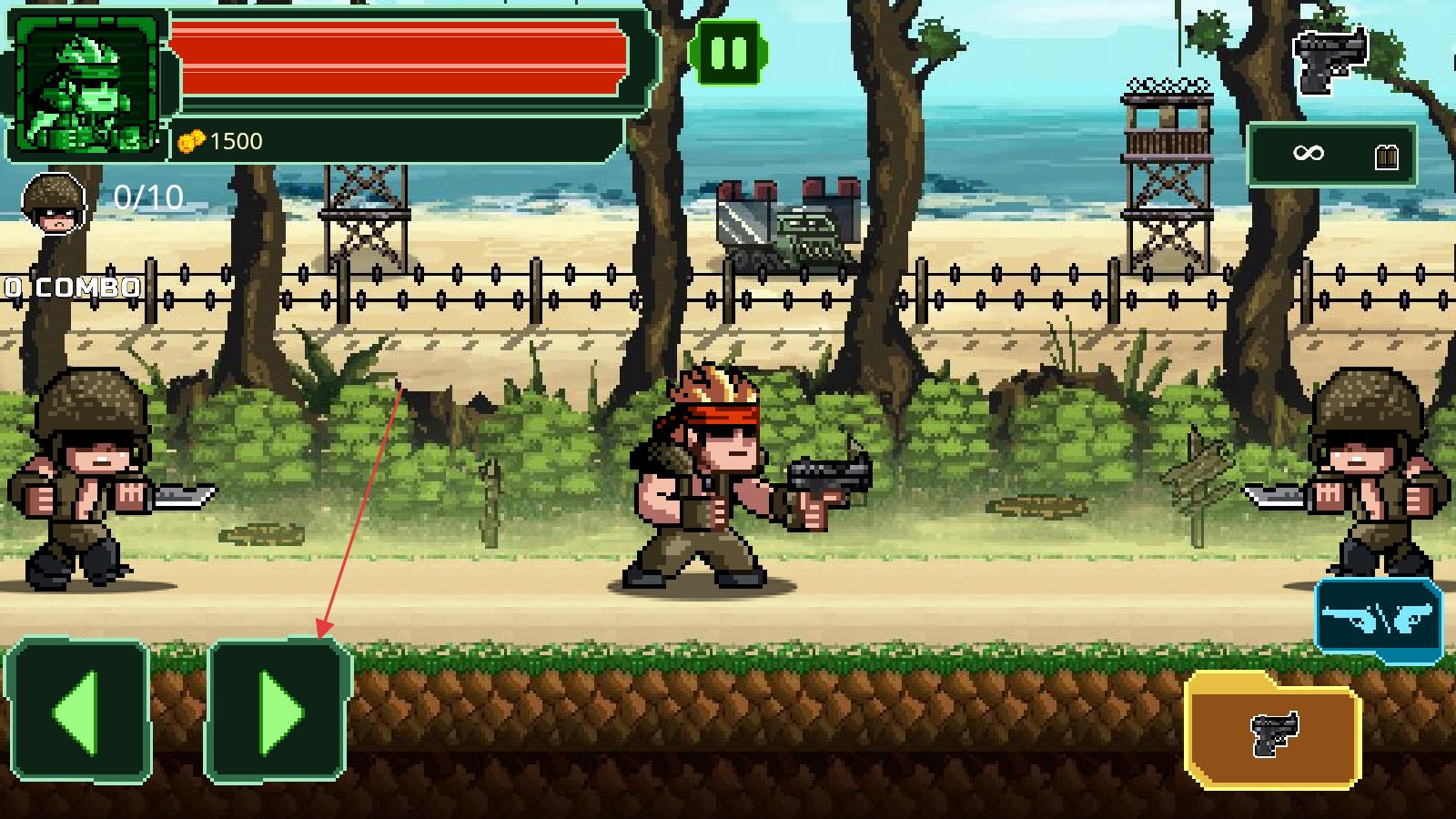 3、進(jìn)入戰(zhàn)斗場景,操控角色移動(dòng),利用下方綠色箭頭按鈕前進(jìn),遇到敵人時(shí),點(diǎn)擊右側(cè)攻擊按鈕,展開戰(zhàn)斗對抗。