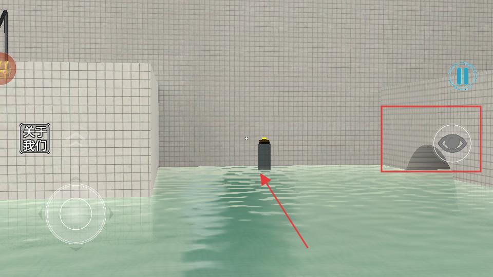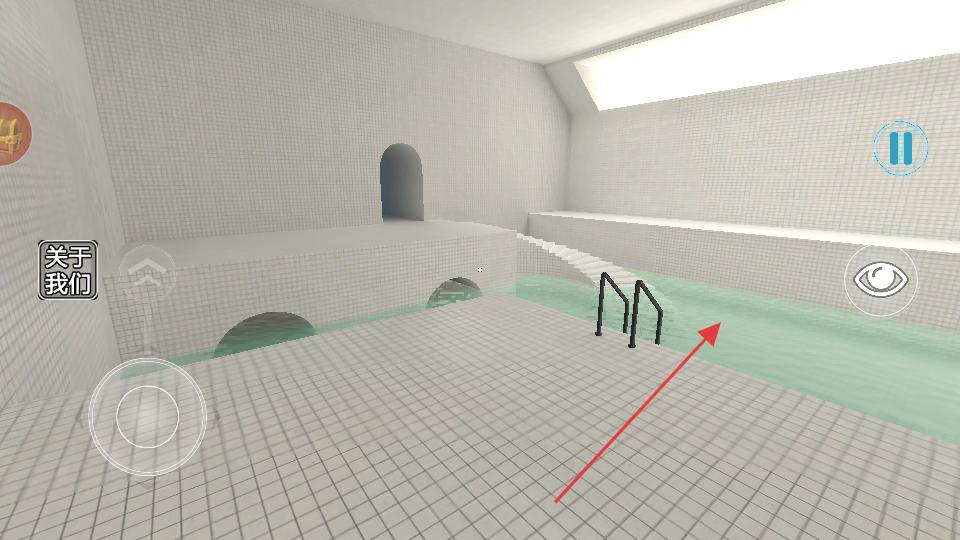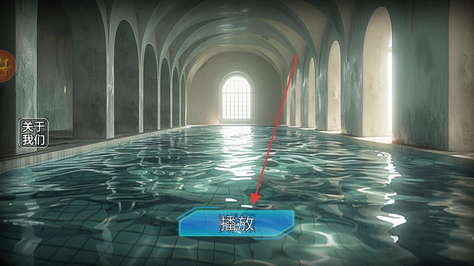 2、點(diǎn)擊中央播放按鈕,進(jìn)入密室泳池場(chǎng)景,拱形通道與水面構(gòu)成環(huán)境,左側(cè)關(guān)于我們按鈕可了解游戲信息,正式開(kāi)啟探索之旅。