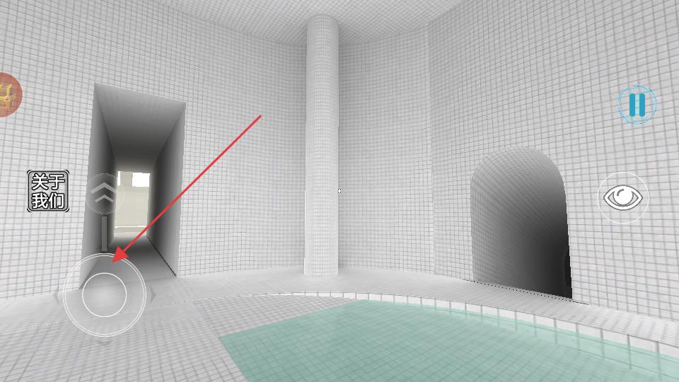 3、場(chǎng)景內(nèi)左側(cè)虛擬搖桿操控移動(dòng),指引角色向通道行進(jìn),穿過(guò)門洞進(jìn)入白色瓷磚房間,觀察右側(cè)拱門與前方路徑,規(guī)劃后續(xù)探索的方向。