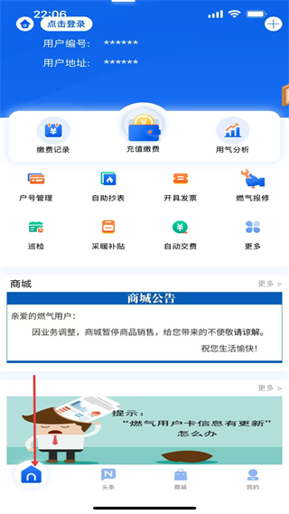 2、首頁功能入口含繳費記錄、充值繳費等,服務(wù)涵蓋戶號管理、燃氣報修等,商城因業(yè)務(wù)調(diào)整暫停商品銷售。