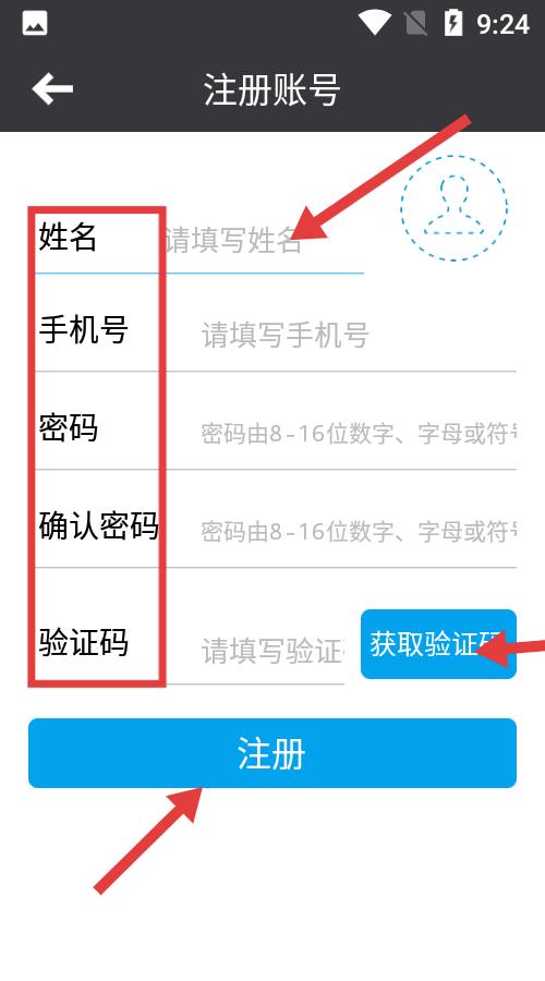 3、注冊(cè)賬號(hào)頁面表單規(guī)范姓名手機(jī)號(hào)等信息項(xiàng)明確,密碼需符合格式,獲取驗(yàn)證碼功能便捷,藍(lán)色注冊(cè)按鈕醒目,指導(dǎo)用戶完成賬號(hào)注冊(cè)流程。