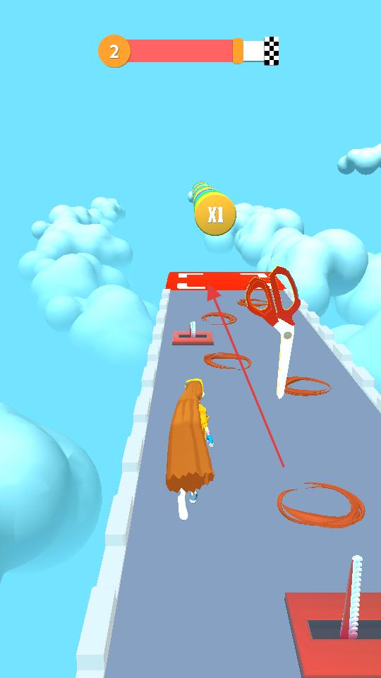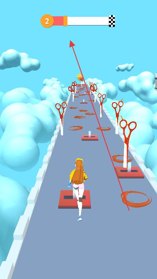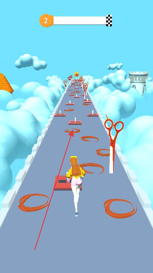 1、操控角色在云端跑道前進,收集棕色頭發(fā),躲避紅色剪刀,保持方向穩(wěn)定,讓頭發(fā)積累變長。