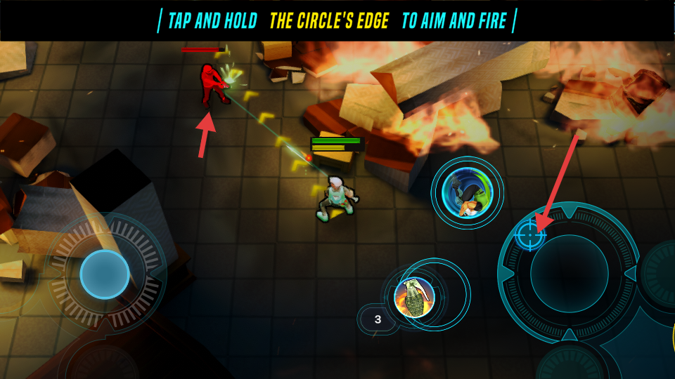 3、戰(zhàn)斗過程中點(diǎn)擊并按住圓圈的邊緣,就可以進(jìn)行瞄準(zhǔn)操作,松開手指便能射擊敵人,好好利用這個操作去對抗場景里的敵人。