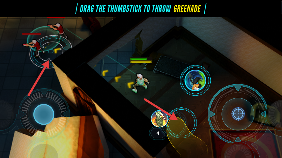 4、要是想要投擲手榴彈,就拖動操縱桿朝著敵人所在的方向投擲,這樣能夠?qū)橙嗽斐煞秶鷤?,幫助玩家取得?zhàn)斗的勝利。