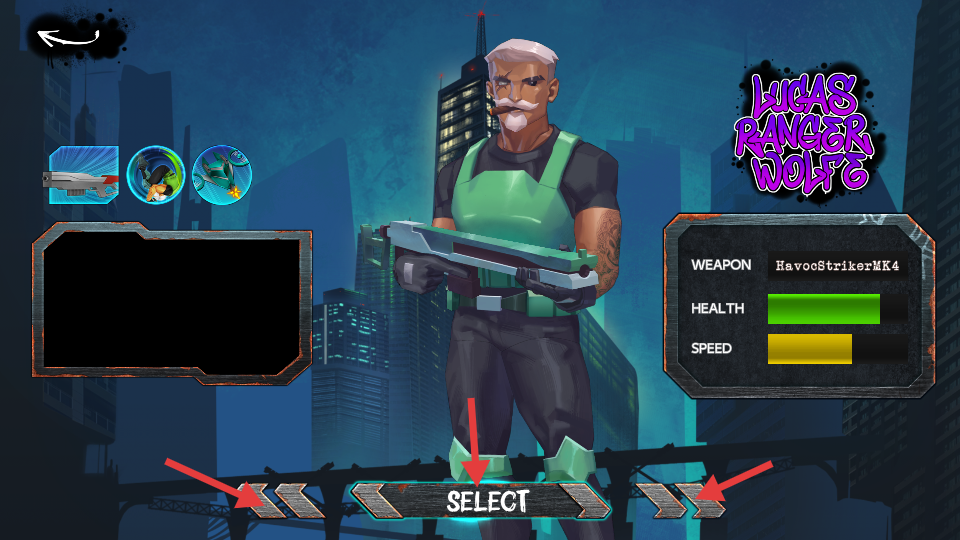 2、玩家在角色選擇界面可,借助左右箭頭來切換不同的角色,挑選出心儀的角色后,點(diǎn)擊SELECT按鈕,就能確定使用該角色進(jìn)行游戲。