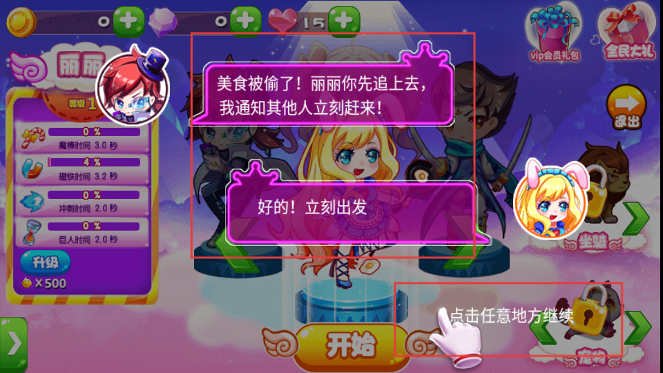 2、遇到美食被偷的情況,點(diǎn)擊任意地方繼續(xù),然后操控角色麗麗出發(fā)追趕,開啟奔跑收集的環(huán)節(jié)。