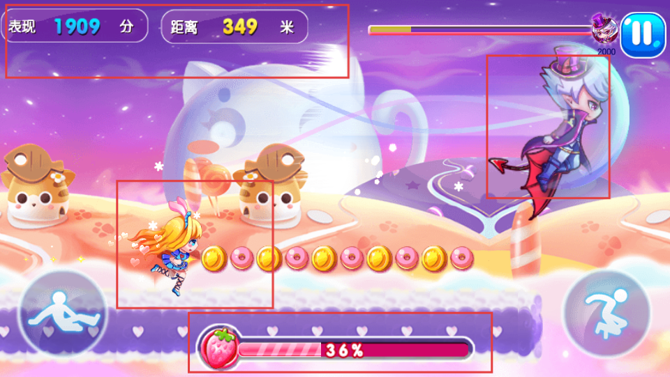 3、在奔跑過程中操控角色收集金幣、甜甜圈等物品,留意表現(xiàn)分?jǐn)?shù)和奔跑距離,還有草莓進(jìn)度條,持續(xù)前進(jìn)。