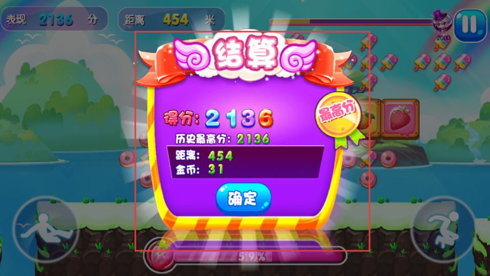4、奔跑結(jié)束后,會出現(xiàn)結(jié)算界面,展示得分、歷史最高分、距離和金幣等,點(diǎn)擊確定,可繼續(xù)下一次游戲。