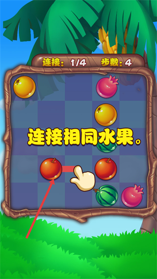 1、看到棋盤上分布著各種水果,按照提示連接相同的水果,每次連接會(huì)推進(jìn)游戲進(jìn)度,開始闖關(guān)。