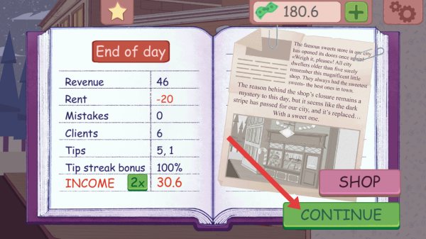 4、一天結(jié)束后,會顯示Endofday界面,呈現(xiàn)當天的收入、租金、失誤等明細,還有最終收入,點擊CONTINUE可繼續(xù)游戲。