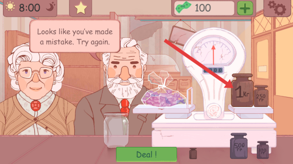 1、游戲根據(jù)顧客需求用不同重量的砝碼給甜品稱重,若操作錯誤,會收到看起來你犯了個錯誤再試一次的提示,需重新操作。