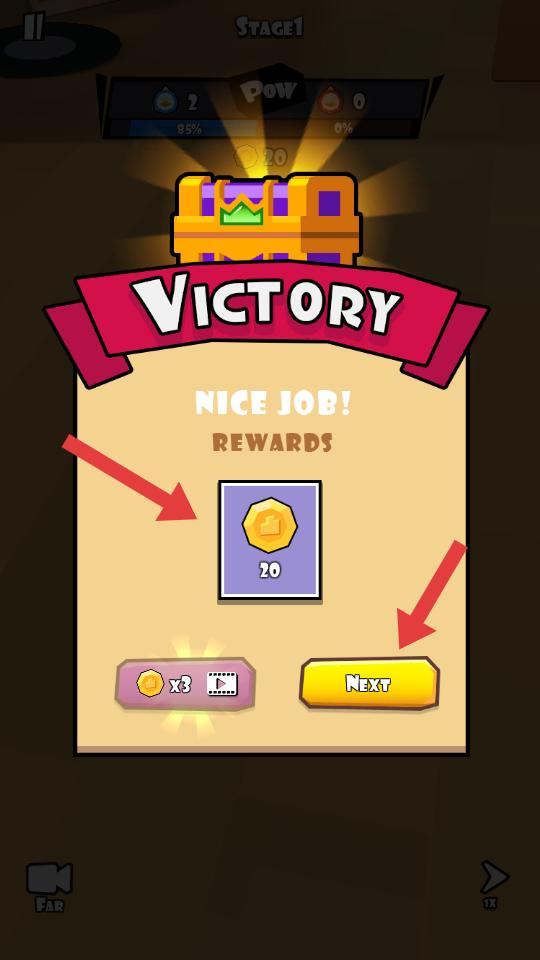 3、成功獲勝后,會(huì)出現(xiàn)VICTORY的勝利界面,顯示獲得的獎(jiǎng)勵(lì),比如20個(gè)金幣,點(diǎn)擊NEXT按鈕,就能進(jìn)入下一個(gè)關(guān)卡繼續(xù)挑戰(zhàn)。