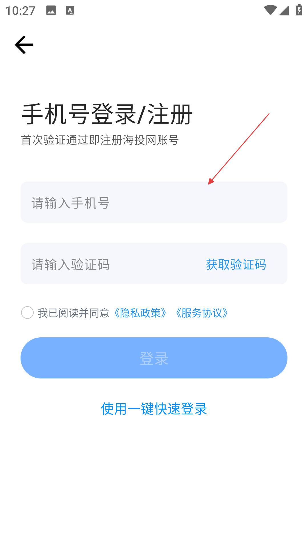 1、用戶需輸入手機號和驗證碼,勾選同意隱私政策和服務協(xié)議后登錄,也可選擇一鍵快速登錄,首次驗證通過即可注冊賬號。