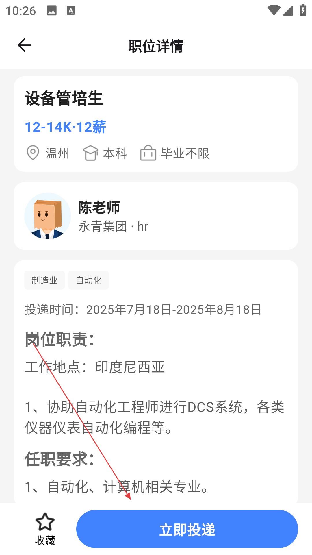 3、設備管培生職位詳情頁面,求職者可查看崗位職責和任職要求,合適可點擊立即投遞。