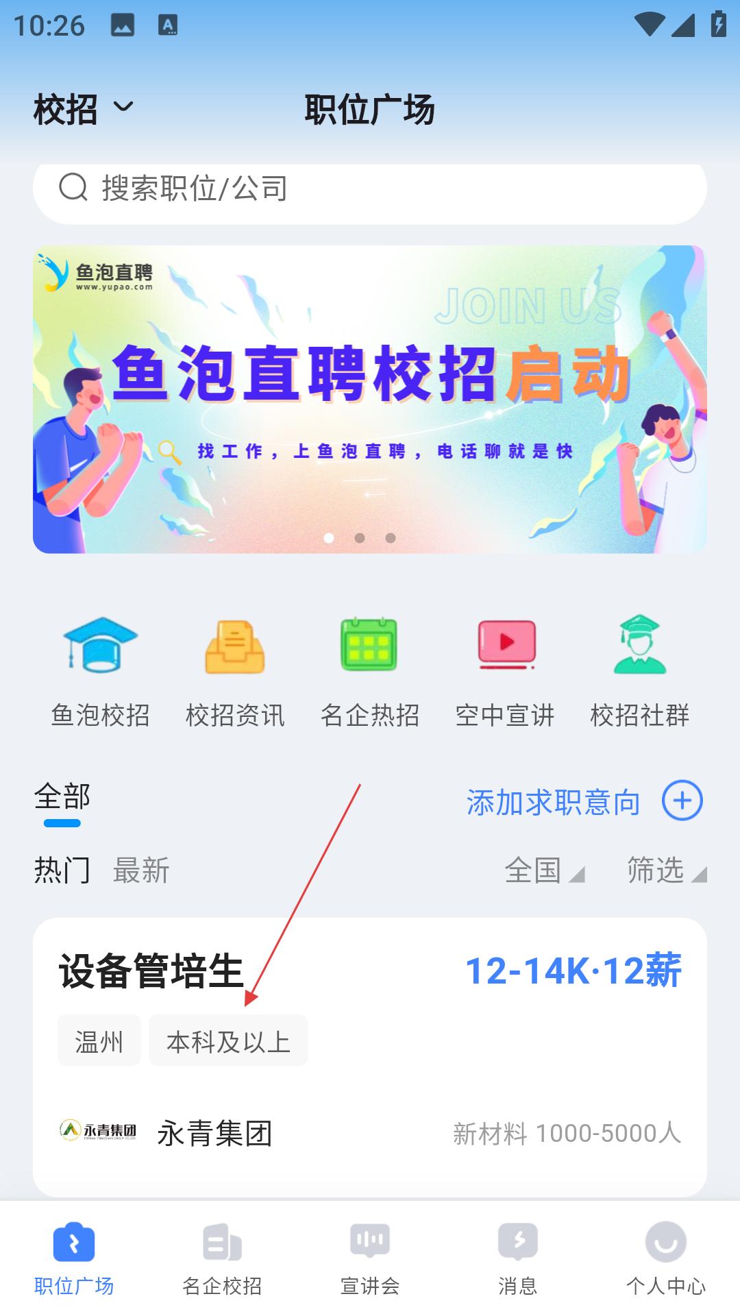 2、職位廣場頁面,展示了校招相關的各類功能入口,還有永青集團的設備管培生等職位信息,方便求職者查找合適崗位。