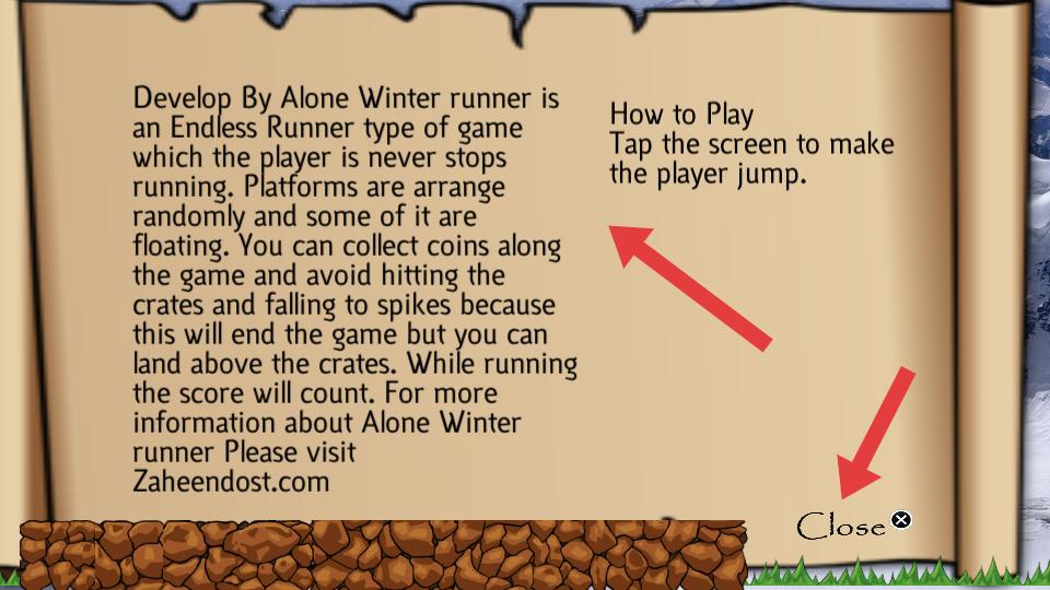 1、游戲開始前,會(huì)有玩法說明界面,提示點(diǎn)擊屏幕讓角色跳躍,了解后點(diǎn)擊Close關(guān)閉,即可準(zhǔn)備進(jìn)入游戲。