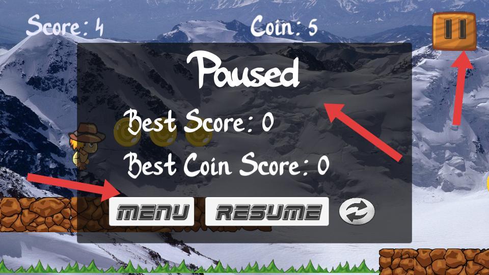 3、游戲中點(diǎn)擊右上角暫停按鈕,會(huì)彈出暫停界面,顯示最佳分?jǐn)?shù)等,可選擇MENU返回菜單或RESUME繼續(xù)游戲。