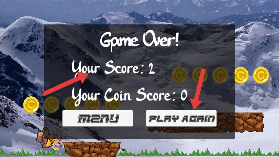 4、游戲結(jié)束會(huì)顯示Game Over界面,呈現(xiàn)本次得分和金幣數(shù),想再玩就點(diǎn)擊PLAY AGAIN,重新開始奔跑挑戰(zhàn)。