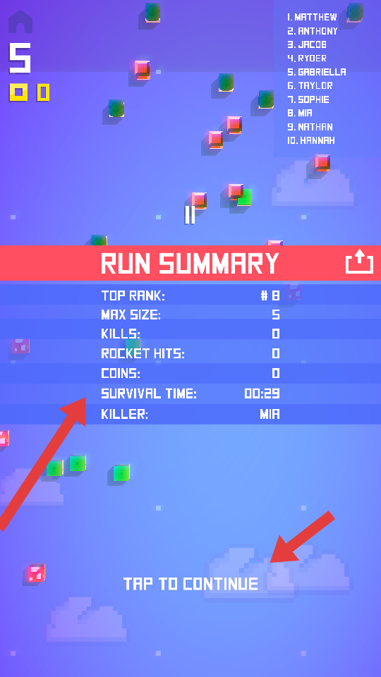 4、游戲結(jié)束后,會(huì)顯示RUN SUMMARY,展示TOP RANK,MAX SIZE等數(shù)據(jù),點(diǎn)擊TAP TO CONTINUE,可繼續(xù)游戲或查看其他內(nèi)容。