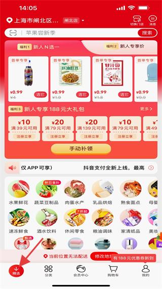 1、上海閘北區(qū)頁(yè),有新人專(zhuān)享0.99元商品、188元禮包,APP專(zhuān)屬抖音支付優(yōu)惠,品類(lèi)涵蓋生鮮百貨等。