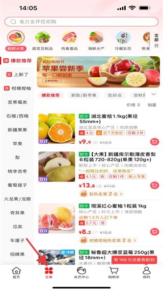 2、大潤(rùn)發(fā)分類(lèi)頁(yè),設(shè)蘋(píng)果嘗新季板塊,展示湖北蜜桔、新.疆香梨等商品價(jià)格,分類(lèi)清晰便于選購(gòu)。