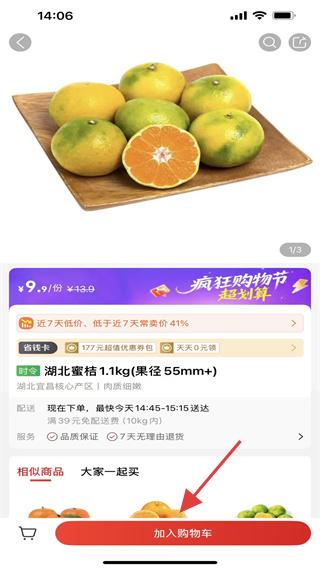 4、湖北蜜桔詳情頁(yè),1.1kg果徑55mm蜜桔售9.9元,有買(mǎi)7天低價(jià)、優(yōu)惠券包,支持品質(zhì)保證和7天無(wú)理由退貨,可加入購(gòu)物車(chē)。