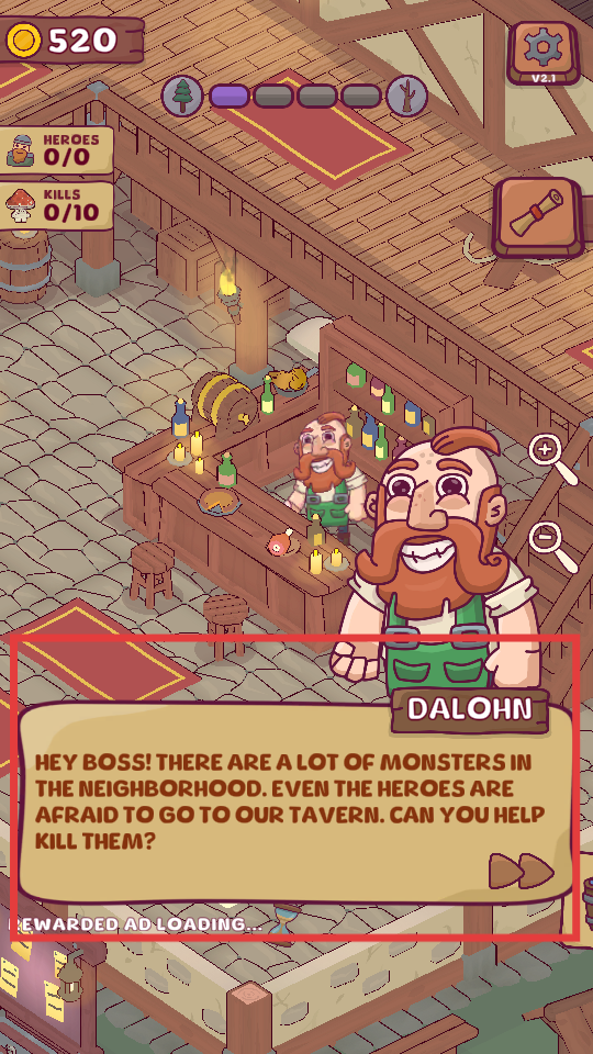 1、進(jìn)入游戲,來到酒館場景,了解到附近有很多怪物,英雄們都不敢來酒館,需要去消滅怪物。